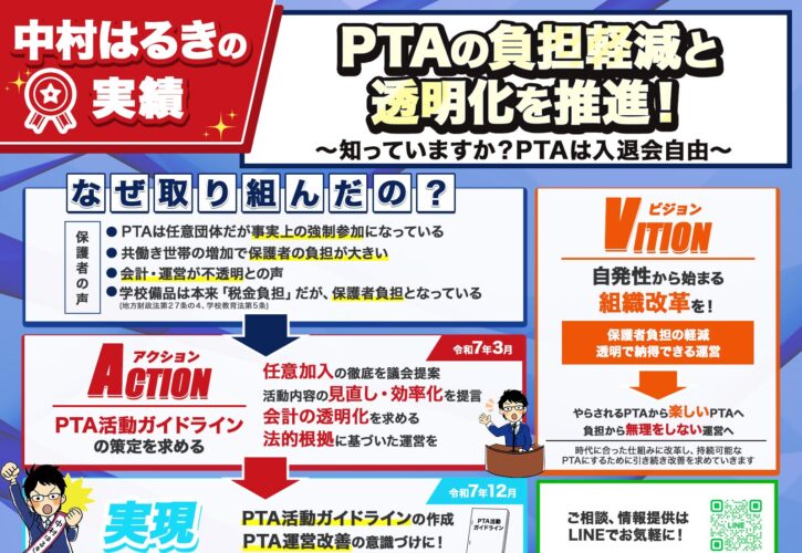 令和7年3月、PTA活動について、任意加入の徹底、活動内容の見直し・効率化、会計の透明化、法的根拠に基づいた運営を進めるためPTA活動ガイドラインを策定するよう議会で提案しました。アクション